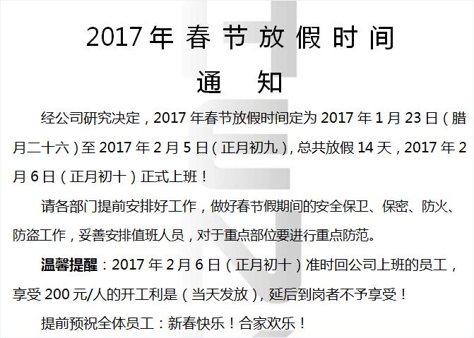 春節(jié)即將來(lái)臨,漢高機(jī)械決定在2017年1月23號(hào)開始放春假,有關(guān)各種業(yè)務(wù)的客戶請(qǐng)注意請(qǐng)注意請(qǐng)注意,為避免假期期間可能造成不必要的損失,請(qǐng)?zhí)崆鞍才藕霉ぷ?,重要的事情說(shuō)三遍!