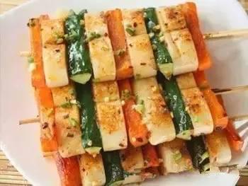 3. 將年糕、胡蘿卜、青瓜用竹簽串起來。